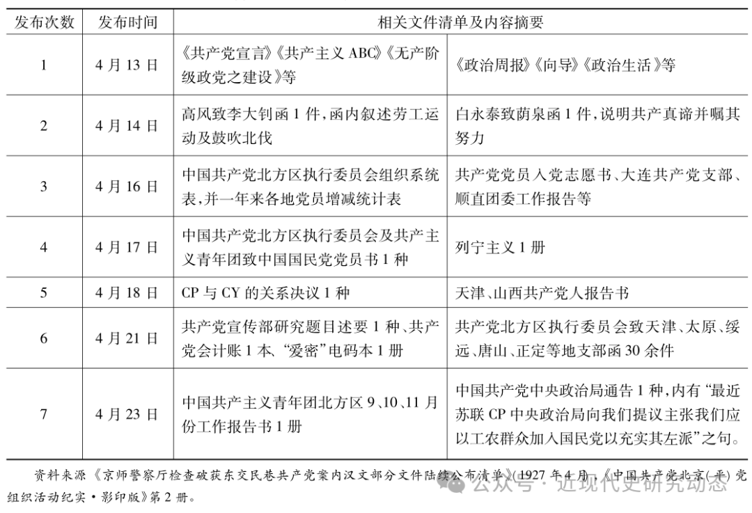 另一方面,关于中国、李大钊的文件,奉系当局无疑更为重视。李星华曾谈道:“早在工友闫振山被捕前,父亲就把党的文件、名单都烧掉了,这是我亲眼看到的。敌人把从庚子赔款委员会搜查出来的中央政治委员会的印章等等也都当作的重大罪证公布。”尽管李大钊被捕之前烧掉了一些重要文件,但从京师警察厅公布的文件中,还是发现了一些与中国、李大钊相关的文件。4月13日,京师警察厅对外宣称:“京师警察厅检查破获东交民巷部案内汉文部分。该项文件为数甚多,关于该党部文卷及来往公私函电,印刷品如书籍、传单、图画等内容,关系极为重要……兹将检查重要者陆续公布。”此后,京师警察厅分别于13日、14日、16日、17日、18日、21日、23日陆续7次发布与之相关的文件,数量达224项之多。这些发布的文件不仅含有清单,而且还作了概括性的介绍。简要情况如下表所示:
